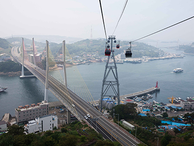 돌산 섬과 육지를 연결하는 국내 최초 해상 케이블카를 탑승합니다.