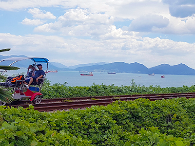 탁 트인 바다를 전망하며 해안길을 따라 달리는 여수 해양레일바이크를 탑승합니다.